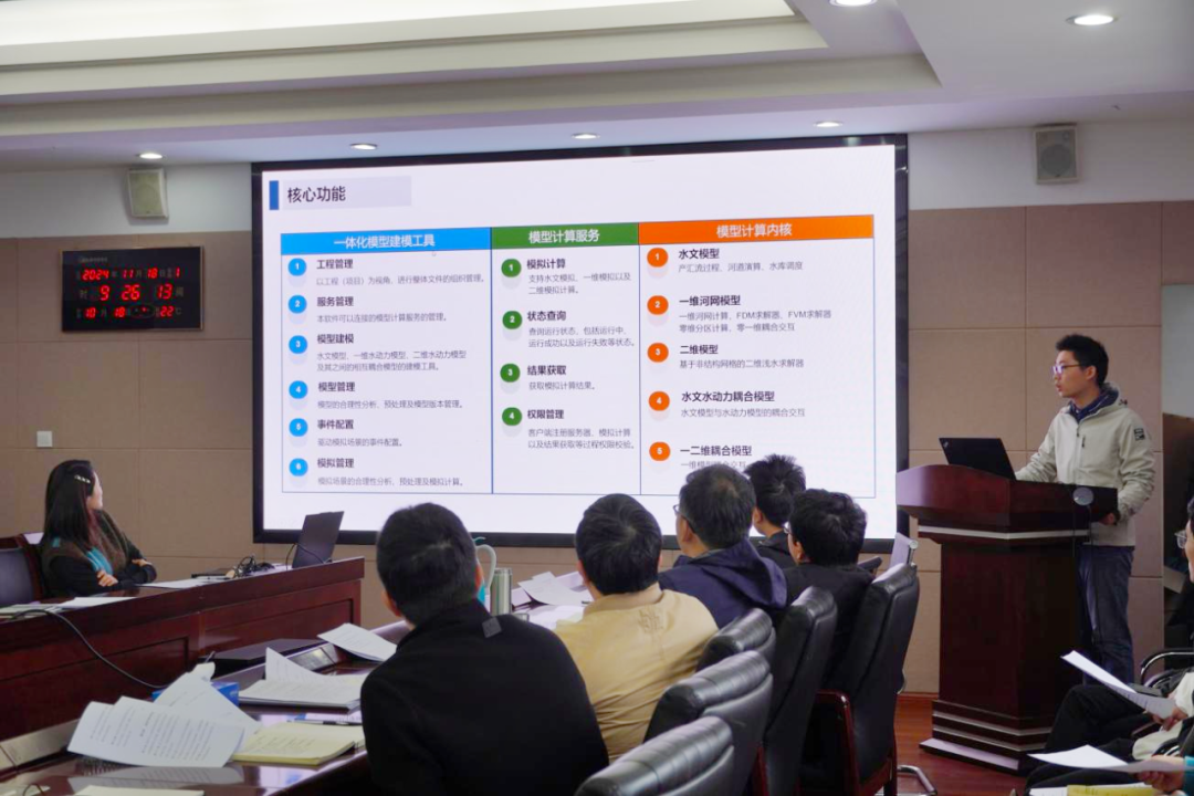 隨后,平臺(tái)研發(fā)團(tuán)隊(duì)代表陳龍贊對(duì)“澤圖水文水動(dòng)力一體化模型平臺(tái)”進(jìn)行詳細(xì)介紹,并進(jìn)行現(xiàn)場(chǎng)實(shí)操演示。該平臺(tái)是一套我院自主研發(fā)的以組件化建模、并行化求解、在線化計(jì)算、一體化耦合、國產(chǎn)化支持為核心的水文水動(dòng)力模型平臺(tái),能夠滿足包括產(chǎn)匯流計(jì)算、水庫調(diào)度、一維河網(wǎng)、二維淹沒、水文水動(dòng)力耦合、一二維水動(dòng)力耦合在內(nèi)的多種模擬需求,適用于獨(dú)立部署、嵌入第三方項(xiàng)目等多種應(yīng)用場(chǎng)景?;诮9ぞ摺⒛P头?wù)、計(jì)算核心三分離的設(shè)計(jì)架構(gòu),平臺(tái)具備分布式部署、集群化管理、多節(jié)點(diǎn)負(fù)載均衡的動(dòng)態(tài)能力,滿足靈活適用多種尺度的計(jì)算需要。